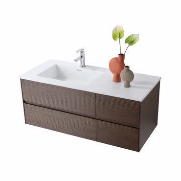 Waschbecken Set WONDA 120 cm linksseitiges Becken Mattweiß Kunstmarmor mit Unterschrank Nussbaum Dunkel