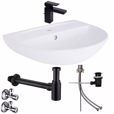 Waschbecken Komplettset Tulpe 55 cm mit Hansgrohe Armatur Ablaufgarnitur schwarz und Siphon Eckventil